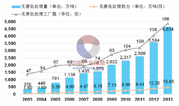 根据国家统计局数据,2003-2013年,我国城市生活垃圾焚烧无害化处理量